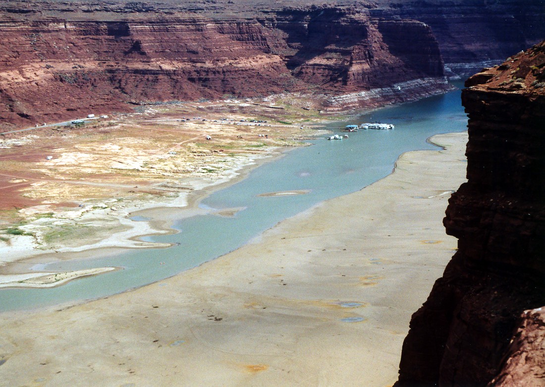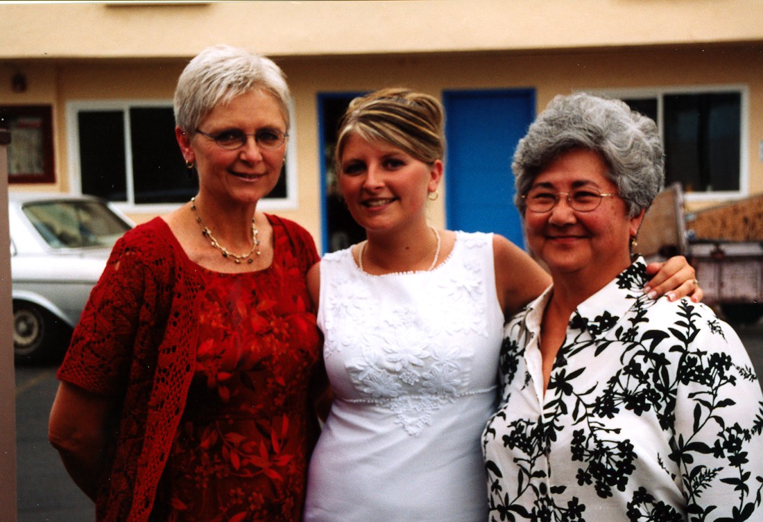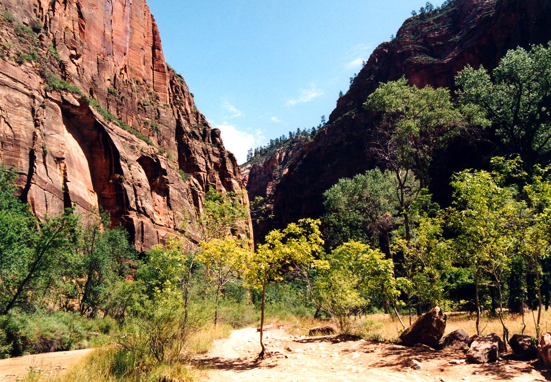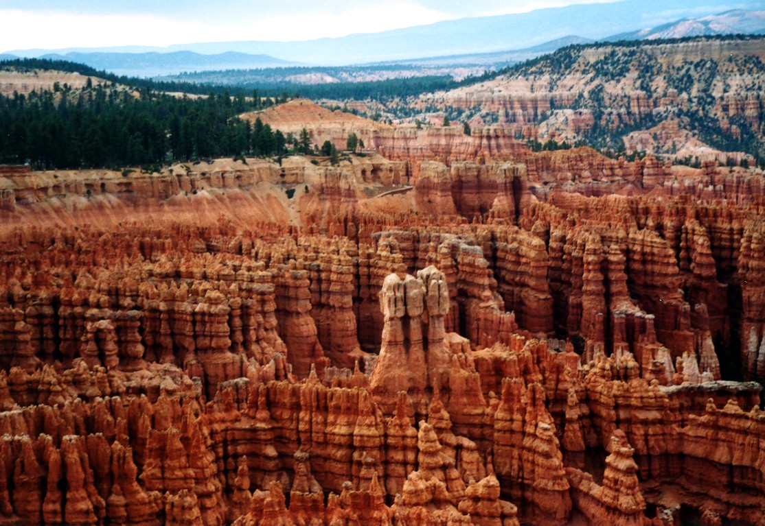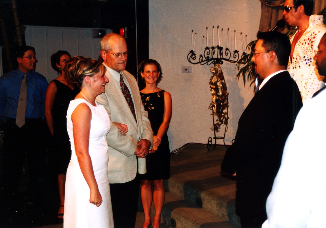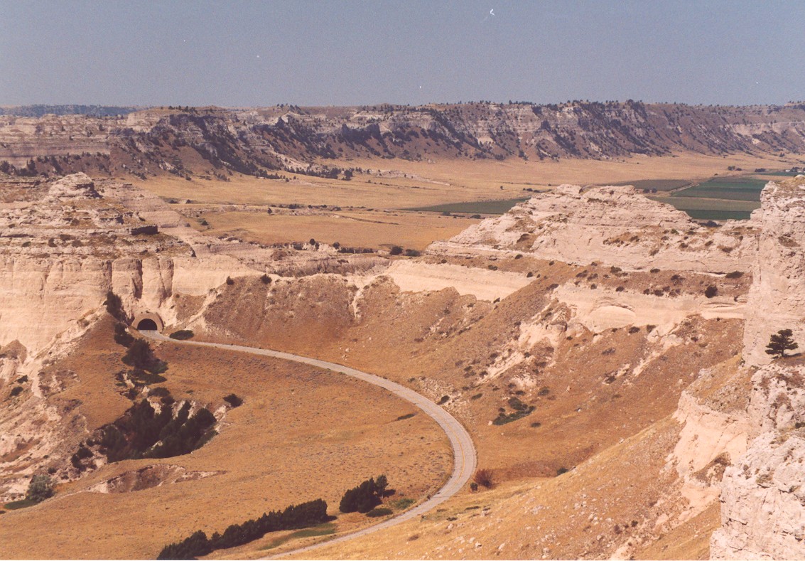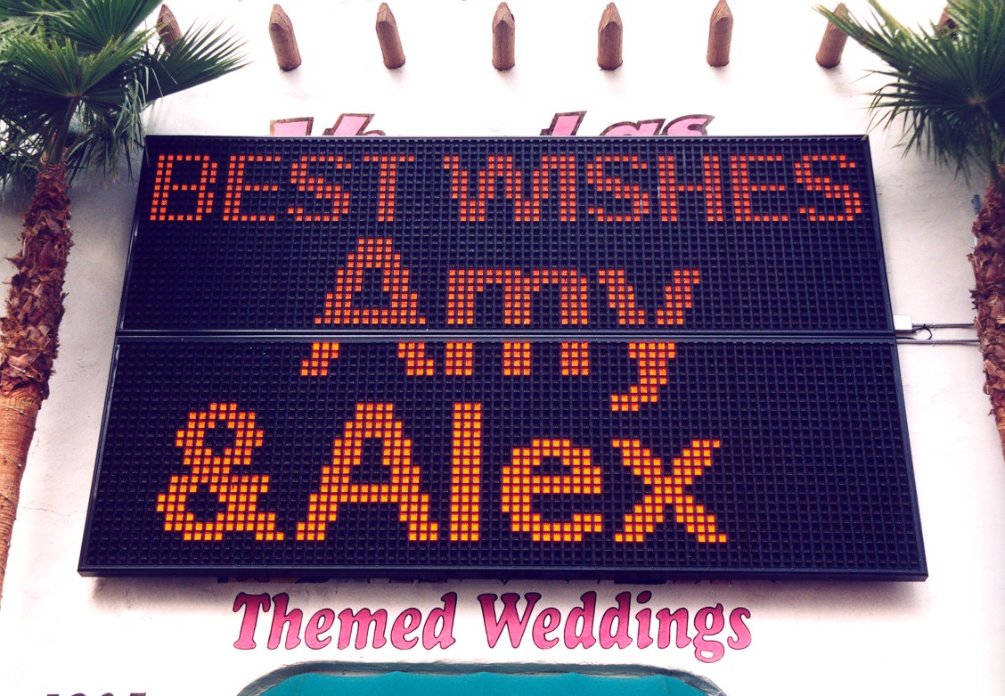 We headed west on July 19, 2003 to attend our son’s wedding in Las Vegas, NV.  I-70 continues to have numerous construction sites but once across the Mississippi River, the speed picks up.  The Colorado National Monument, outside Grand Junction, CO, provided a view I had not seen before.  Of many ridge top views, one of the striking sights in the late afternoon sun was Independence Monument.  In the background is Grand Junction, CO.  From Grand Junction, we took a scenic back road, CO 141, on into Utah across the La Sal range and crossing over the northern end of Lake Powell via UT 95.  In sharp contrast from my last visit to the area, the Colorado and Dirty Devil Rivers were both way down, due to the drought over the past several years.  The marina was far back from the river’s edge and required extensions to reach the Colorado River/Lake Powell edge.  The entire light colored area used to be underwater and part of Lake Powell.  The Dirty Devil River, which pours into the Colorado River at the north end of Lake Powell, was down to a trickle. Past Lake Powell, at the junction of UT 95 and UT 24, is Hanksville, UT.  A gas station’s store was hollowed out of a sandstone mountain.  The owner indicated they used many cut sticks of dynamite to do the controlled hollowing of the mountain.  When you enter the store, you can see some of the work as you pass through a wall to the restrooms in the rear. Then it was on to Bryce Canyon National Park.  I had originally intended to do some sunrise shots of the canyon but a weather front had moved in overnight and thick clouds greeted my sunrise visit.  A look at Inspiration Point however can make up for the disappointment.  It was still overcast but the beauty of the view still showed through the poor lighting. Being the Bryce Canyon experience was a little disappointing, the visit to Zion made up for it.  Zion National Park was bathed in sunshine.  However, the Virgin River flowing through Zion showed the results of the previous night’s rain up by Bryce Canyon and the Cedars.  On my last visit to Zion, one could drive all the way to the rear of the canyon.  No more can you do this.  One must take a tram through Zion’s vistas.  Only folks staying at the lodge may drive up to the lodge area.  At the far end of Zion, where the tram makes its turn-around are the Narrows.  Here the canyon walls are much narrower, but still as majestic.  One can walk trails through the narrows. Amy Smith and Alexander Sablan were married on July 26, 2003 at the Viva Las Vegas Chapel, Las Vegas, NV.  Charles Smith led his daughter down the aisle. The Sablan side of the aisle.  Others in attendance included friends and W.O. Wright employees. The Smith side of the aisle. The announcement to the world via the chapel’s marquee. Amy and Alexander Sablan -  May the Lord bless their marriage.  A proud mother with her married son. Two proud mother’s with Amy. After the wedding, we set out for the Grand Tetons National Park in Wyoming.  Again, I was looking for a morning view of the Tetons.  I was not disappointed this time.  The morning was beautiful with just a little hazy.  Standing on the dam creating Jackson Lake, the view of the mountains and their reflections in the lake were just what I wanted. Farther south from the dam is a side trip through Jenny Lake.  From the road you get a good view of what is called the Cathedral Group.  These peaks include the highest - Grand Teton. Above and east of Jackson Lake is Signal Mountain.  The view from Jackson Point, near the top of Signal Mountain, provides a vista which includes all the peaks in the Tetons and a panorama of the surrounding lakes. Heading east, into Nebraska and along the Oregon Trail, is Scotts Bluff National Monument.  Oregon Trail wagon ruts remain and can be viewed near the visitors’ center. The area can best be appreciated by driving or hiking up the Monument for a panoramic view of the Oregon Trail as it goes through the pass.  The pass at Scotts Bluff was not on the original Oregon Trail route but was a new route established when the US Army made it west and shortened the trail by rerouting it through the pass.  The pass runs just left of the bluff with the tunnel. East of Scotts Bluff by about thirty miles is one of the enduring sights for the travelers on the Oregon Trail - Chimney Rock.  When the “Chimney” was sighted, one knew the plains were over and the scenery would soon be changing.  The “Chimney” is starting to lose out to nature, just like all rock formations.  It is now considerably shorter than when the folks were on the Oregon Trail.  Another rock also losing the battle with nature is Registry Cliff outside Guernsey, WY.  Registry Cliff is where the travelers on the trail carved their names and messages into a cliff to pass information on to following wagon trains. Farther east on US 26 is Ash Hollow State Park (east of Lewellen, NE) where one can view more ruts of the Oregon Trail.  Also located along the fence posts are cowboy boots.  No one recalls why the boots were placed there or when, but it had to be since US 26 was built.  Several hundred cowboy boots have been placed upside down on the posts.  Charles Kuralt, in his periodic “On the Road” series, did a story on the Lewellen cowboy boots. A close-up of one boot - still showing some of the artwork. Our last area to visit on our return trip was the Amana Colonies of Iowa.  The colonies no longer are communal in nature but the folks continue the traditions of the colonies.  Amana appliances are now made by Maytag, employing colony folks.  Seven villages make up the colony: Amana, East Amana, High Amana, Middle Amana, West Amana, South Amana and Homestead.  A typical home with artwork and garden is shown and located in Middle Amana. This farmer’s barn is typical of small farms.  Larger barns, without the top protrusion, can be seen in other colony villages. In Middle Amana is Lily Lake where the large yellow lotus l